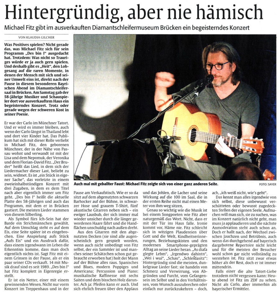 Erstaunlich, wie der sympathische Bayer, der sich in seinen Liedern hauptsächlich mit – fast möchte man sagen –seelischem Sperrmüll beschäftigt, die Menschen landauf und landab, ganz allein mit sich, seiner Stimme und ein paar Gitarren, seinem feinen, augenzwinkernden Humor, seiner Poesie und Leidenschaft, so mitnehmen kann, ohne sich dabei mit allzu eifrigen Zeigefingern und Orientierungs-hilfen anzubiedern.