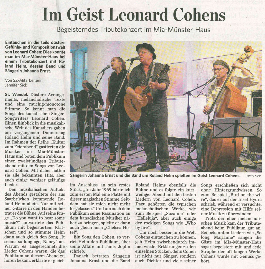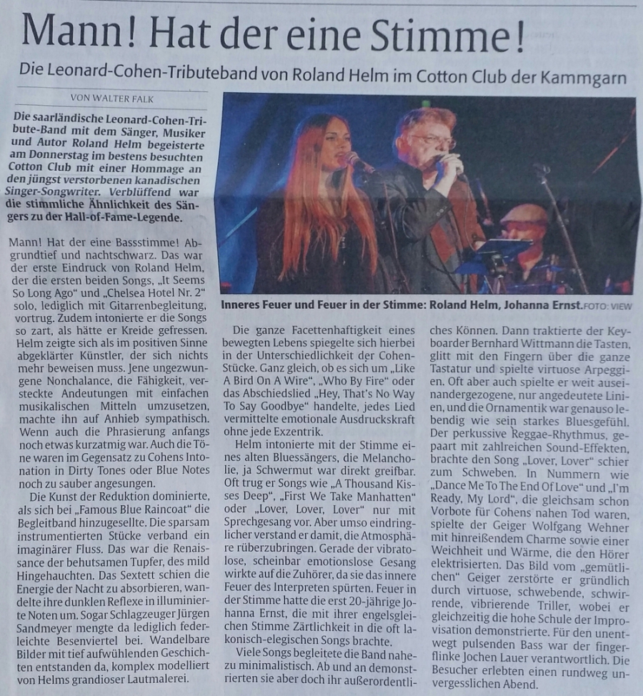 Roland Helm mit Band und Sängerin sind derzeit die einzige deutsche Live-Band, die ein komplettes rund zweistündiges Leonard Cohen Tribute Konzert spielt. Roland Helms Stimme gleicht dabei verblüffend der des Mannes aus Montreal. Zum 80sten Geburtstag des Kanadiers hatte der Saarbrücker Musiker im Herbst 2014 erstmals sein neues Programm gespielt, das alle wichtigen Songs des legendären kanadischen Songwriters aufruft. Die Reaktionen von Publikums und Presse auf dieses Konzert waren euphorisch. Schwerpunkt hier die Klassiker der frühen Alben 1968/69, aber auch unverzichtbare Hits späterer Jahre wie „First we take Manhattan“ oder „Hallelujah“. „Suzanne“ oder „Like a bird on the wire“ dabei recht nah an Cohens Aufnahmen, „Lover, Lover, Lover“ oder „Who by fire“ mit eigenwilligen Soli, die Cohens Musik einen neuen bluesigen Touch geben.
