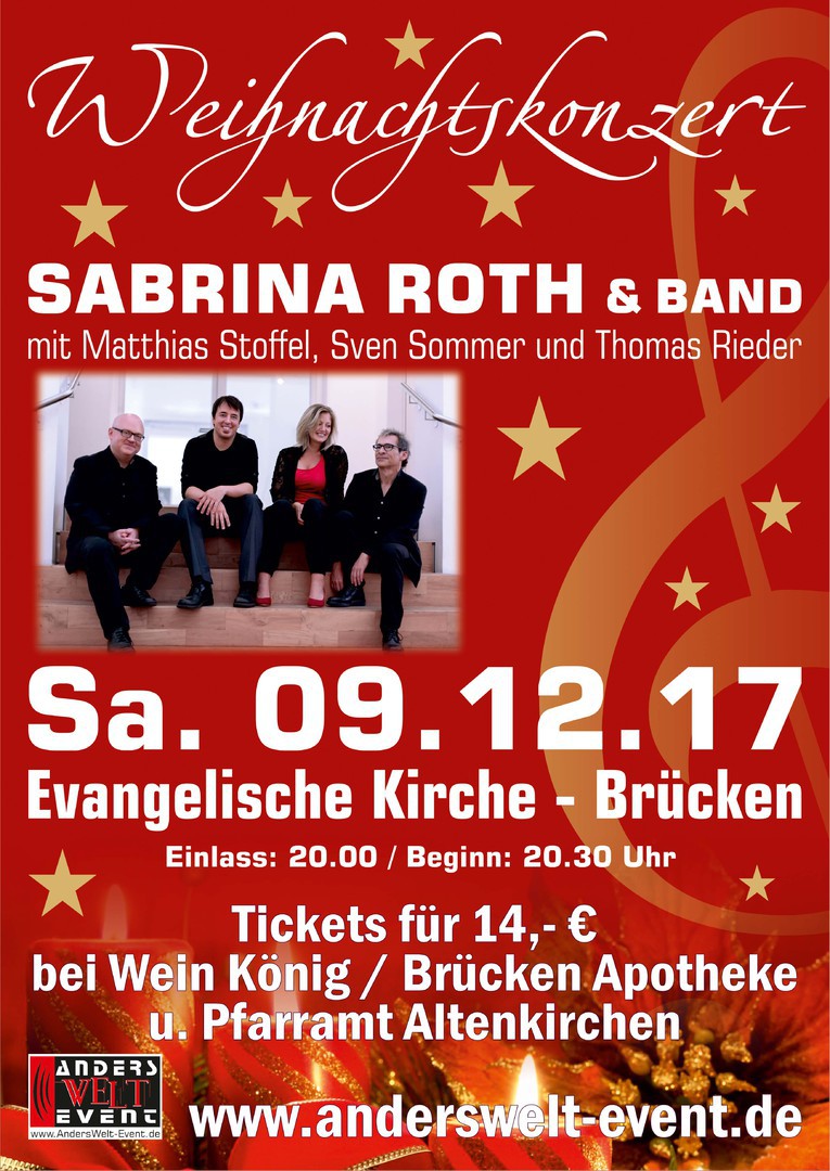 Die mittlerweile lokal etablierte Band um Sängerin SABRINA ROTH hat ihre liebsten Weihnachtlieder zu einem wundervoll weihnachtlichen Konzert zusammengestellt. Zusammen mit dem Pianisten Matthias Stoffel, dem Bassisten Sven Sommer und Thomas Rieder am kleinen Schlagwerk präsentiert Sabrina Roth Easy-Listening vom Feinsten mit winterlich-weihnachtlichem Flair.